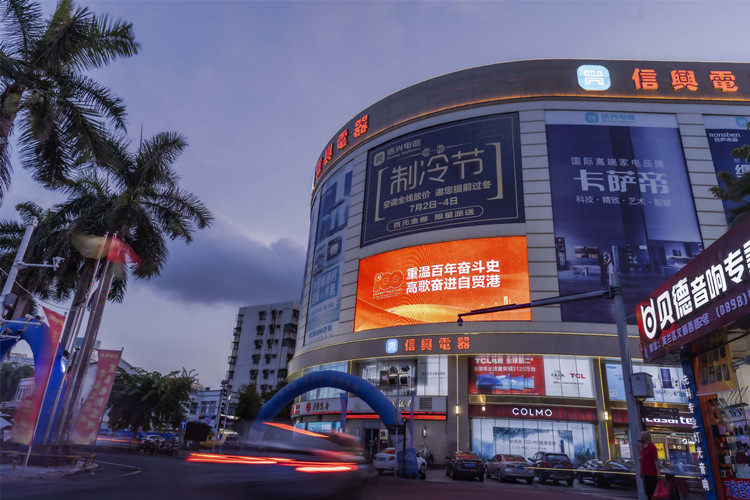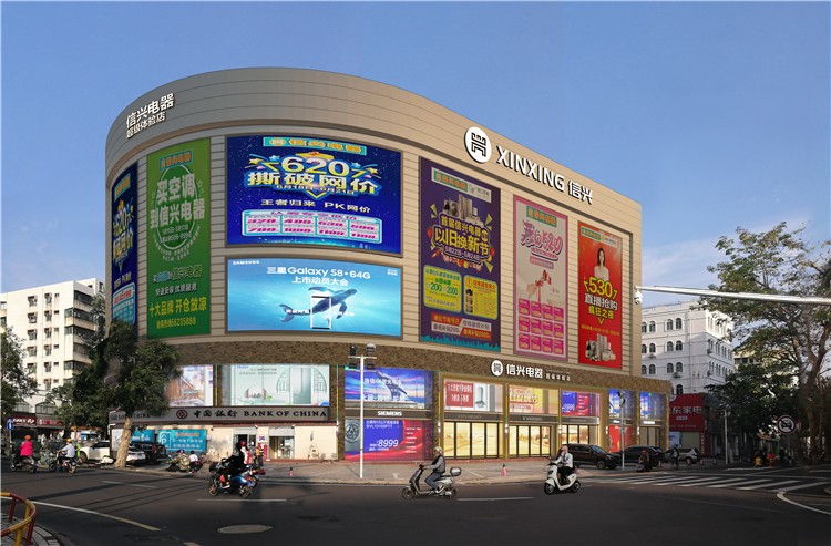 该显示屏位于海口市龙华区新华南路信兴电器旗舰店楼体,是海口家用电器商城集中地,毗邻海秀路,海府路等繁华地段。此路段人流及车流量较为密集,媒体可有效覆盖往来的高端人群,极具投放价值,是展示企业实力,宣传品牌价值的理想选择。